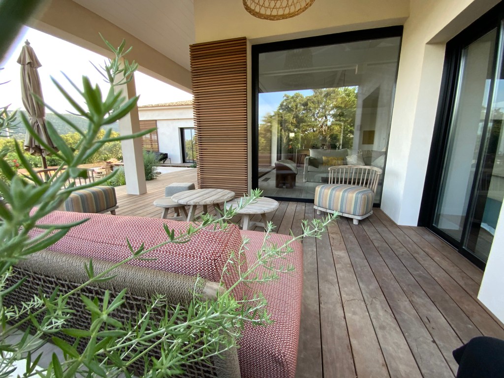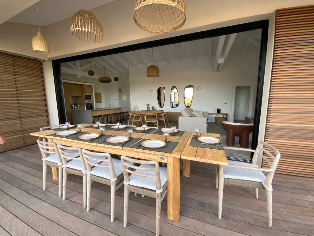 Le séjour donnant sur une large terrasse en bois aménagée avec des bains de soleil, salon de jardin et parasols pour le plus grand confort de ses hôtes.